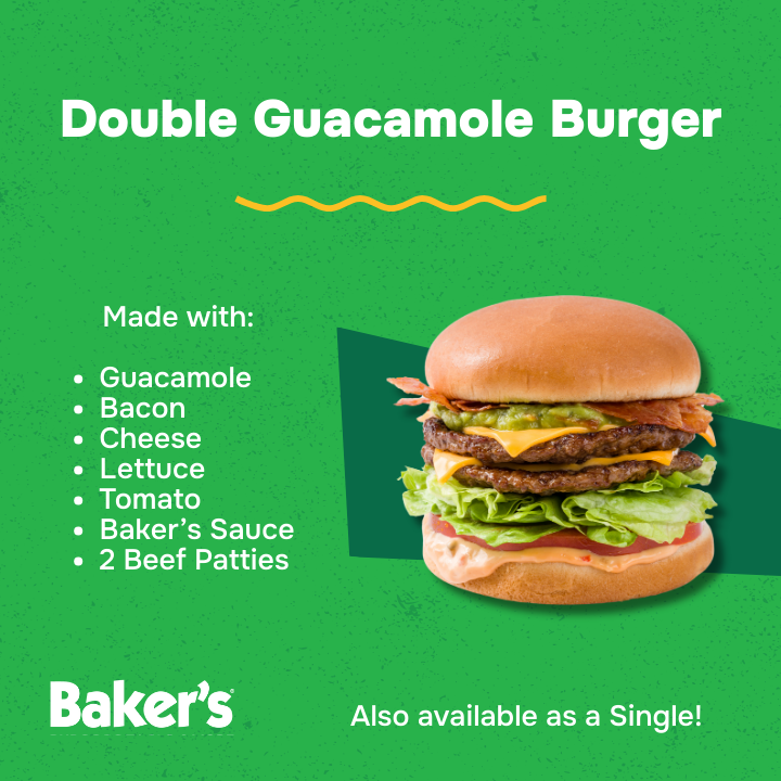 2 Hamburger Patties, Dressing, Sliced Tomato, Leaf Lettuce, Cheese, Guacamole Crema, Bacon on a Toasted Bun