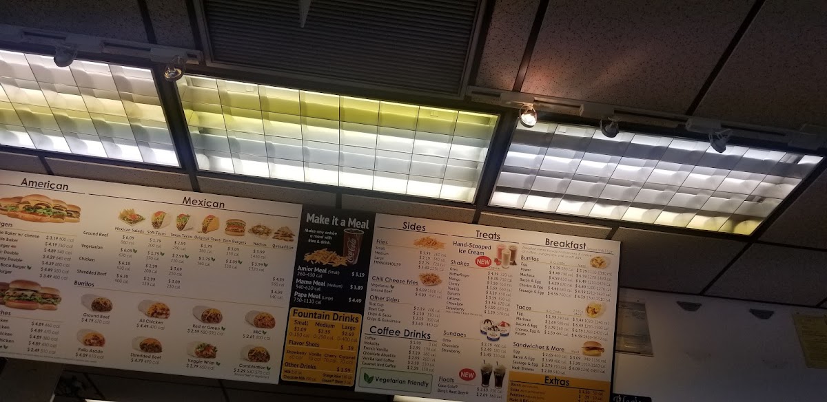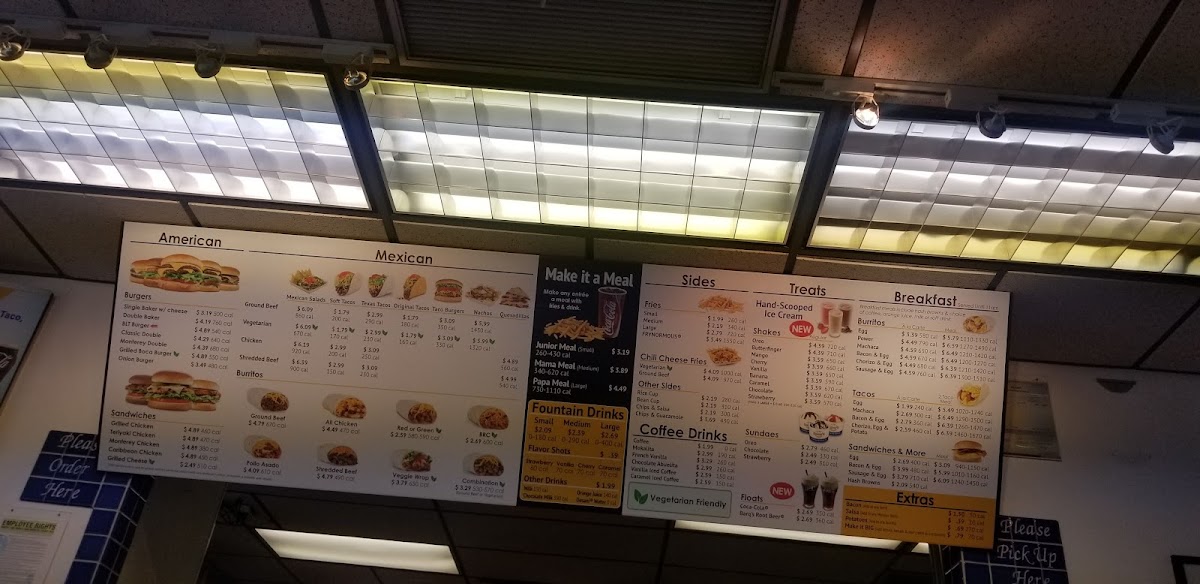 For lunch or dinner, the burger selection stands out with familiar yet satisfying choices like Single Baker, Monterey Double Baker, Triple Baker W/ Cheese, and the bold Single Bacon Guacamole Cheeseburger. Fans of chicken have plenty to enjoy as well, from Crispy Chicken, Crispy Chicken Club, and Grilled Chicken sandwiches to 3pcs Crispy Chicken Strips, 4pcs Crispy Chicken Strips, and the convenient Crispy Chicken Wrap. On the Tex-Mex side, items like Cheese Burrito, Ground Beef Burrito, Combination Burrito, Steak Taco Meal, and Veggie Hard Taco Tuesday add welcome variety, especially when paired with Chips & Salsa or a Chili Cup.