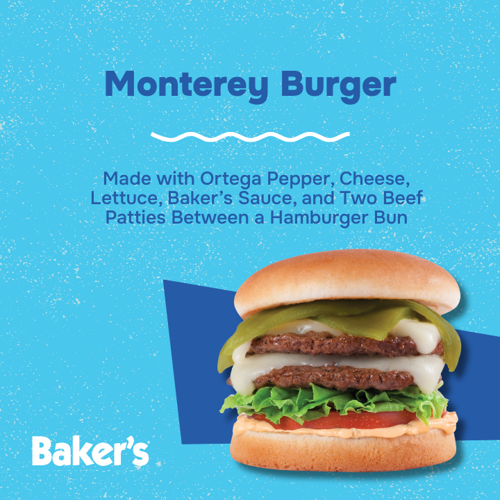 2 Hamburger Patties, Dressing, Tomato. Leaf Lettuce, Monterey Cheese, Ortega Peppers, on a Toasted Wheat Bun
